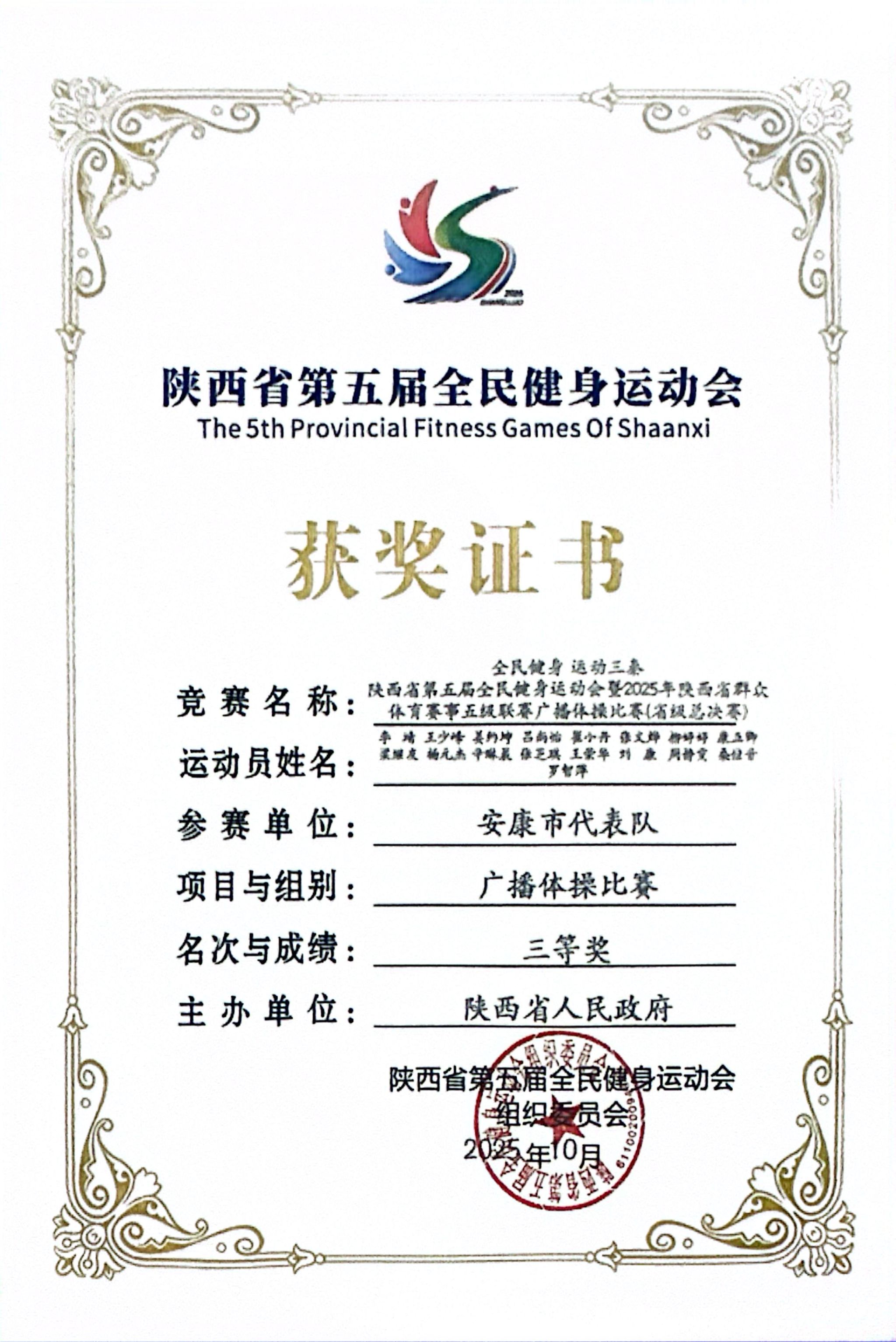 10月13日晚上,由陕西省人民政府主办的陕西省第五届全民健身运动会暨2025年陕西省群众体育赛事五级联赛广播比赛(省级总决赛)在商洛市望江楼广场圆满落幕,我校师生组成的安康市代表队斩获广播体操比赛团体三等奖。