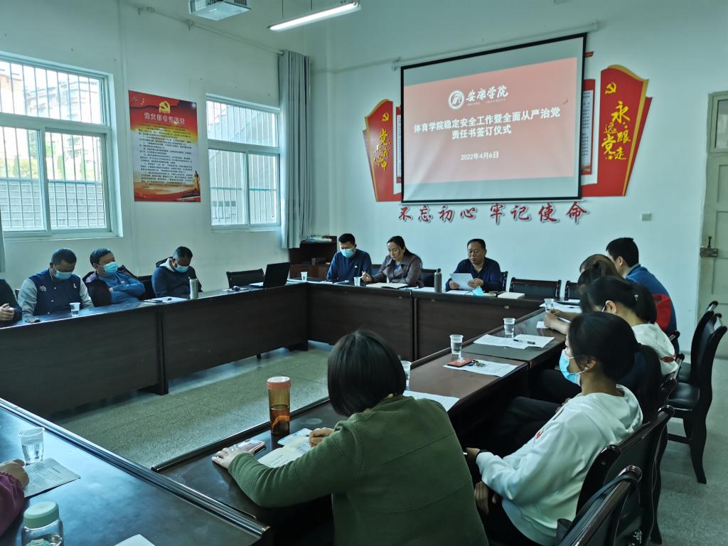 4月6日下午,Beat365官方网站在体育馆一楼会议室召开2022年稳定安全工作暨全面从严治党责任书签订仪式。Beat365官方网站全体教职工参加会议,会议由党总支书记高立平主持。