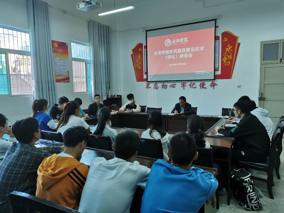 10月19日,Beat365官网在体育馆一楼会议室召开作风建设意见征求学生座谈会,学院党总支书记高立平、学工办副主任王立、团总支书记康梦瑶以及各班学生代表参加了座谈。