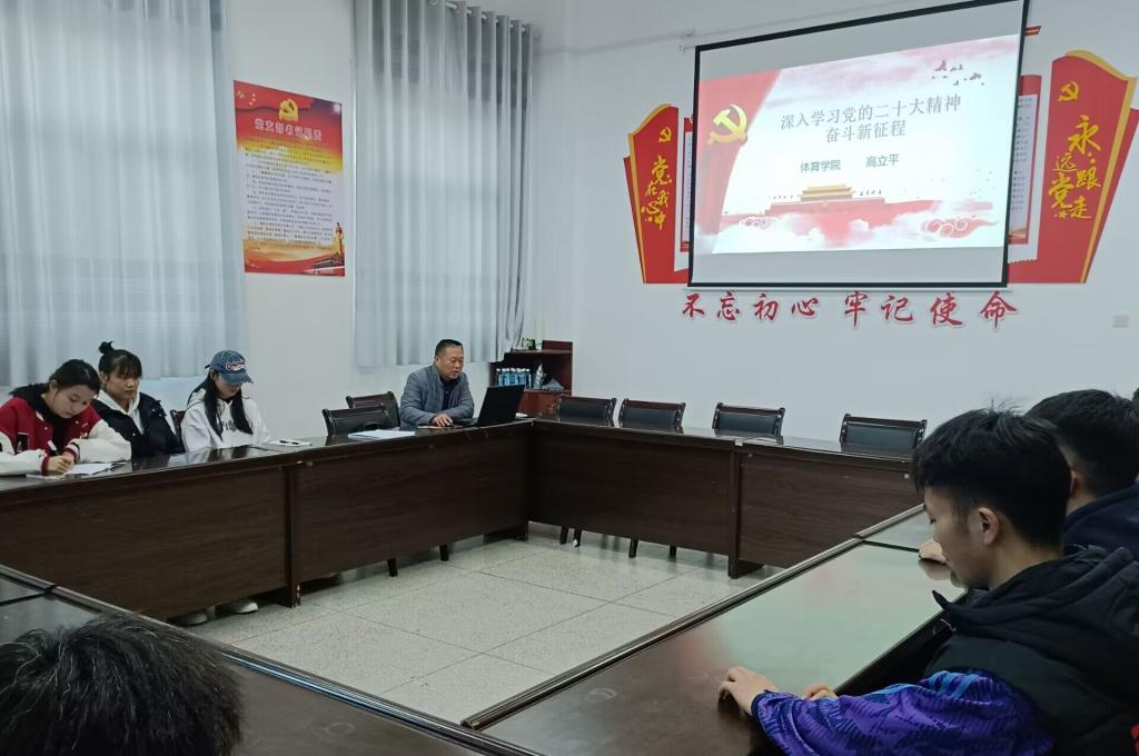 为深入学习宣传贯彻党的二十大精神,2月24日,Beat365官方网站在体育馆一楼会议室开展党的二十大精神专题学习。主讲人Beat365官网党总支书记高立平,Beat365官网全体学生干部参加,会议由康梦瑶老师主持。