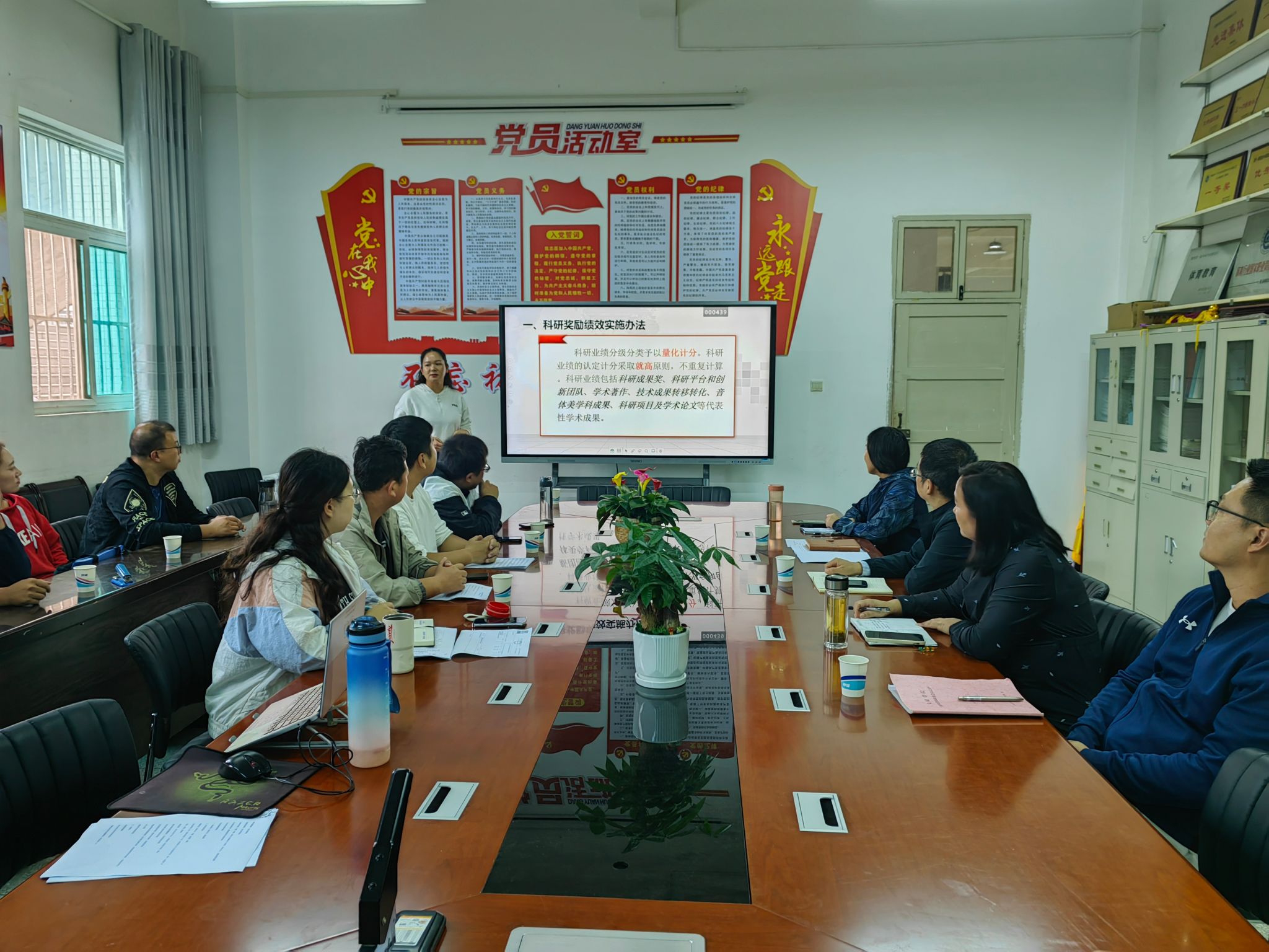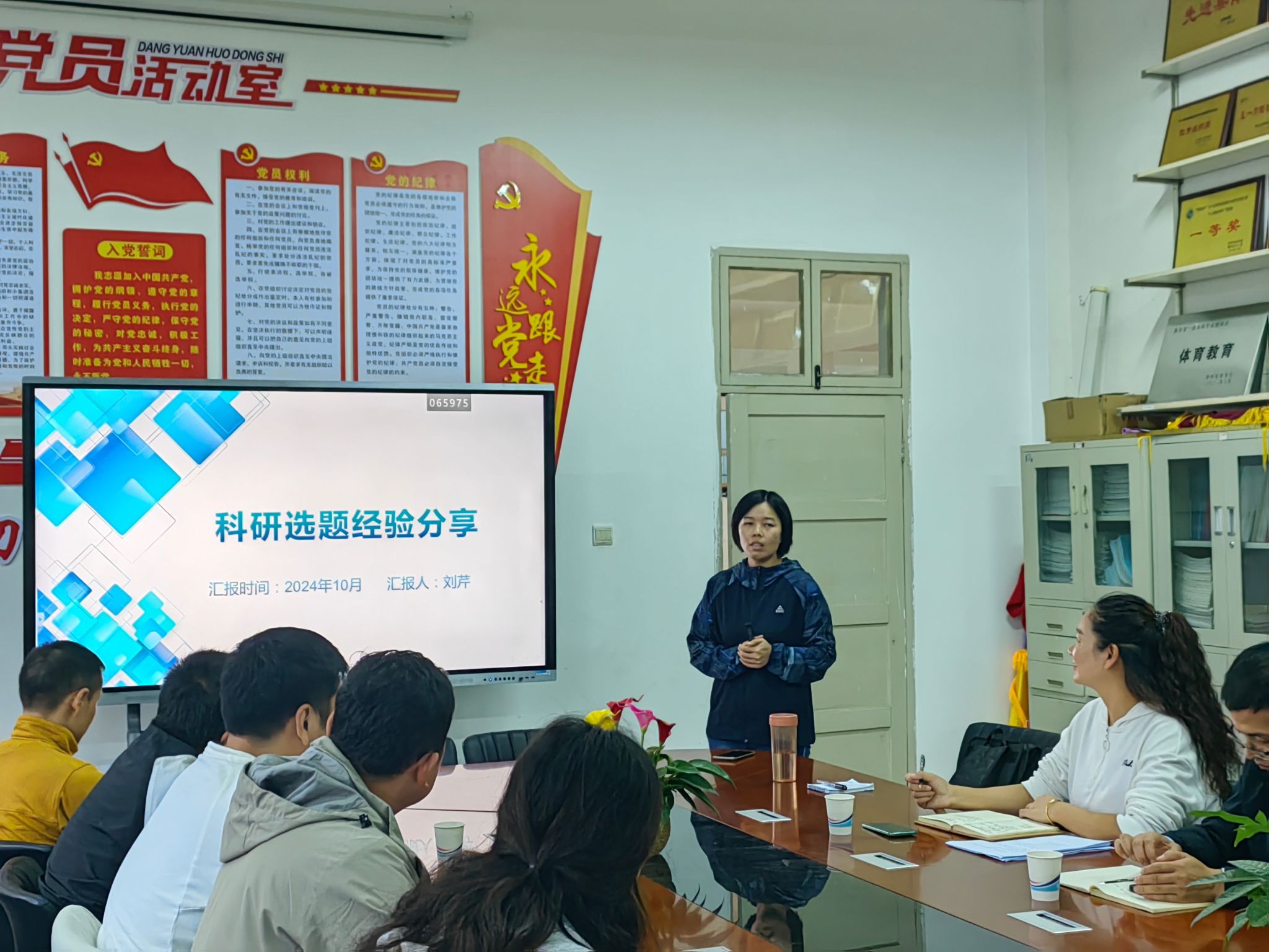 科研副院长李靖为大家介绍了学校科研积分奖励、项目申报、专著、论文发表等相关政策,部署了下一阶段科研的重点工作。体育系主任廖建发汇报了本年度体育系科研情况,并针对所存在的问题,提出了改进措施。教工党支部书记刘芹从选题来源、课题方向、课题大小与选题可行性四个方面分享了科研申报经验。