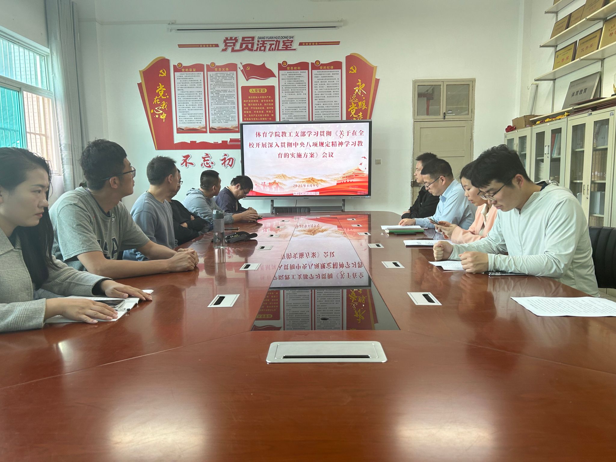 为贯彻落实党的二十届三中全会部署,巩固拓展学习贯彻习近平新时代中国特色社会主义思想主题教育成果,巩固深化党纪学习教育成果,锲而不舍落实中央八项规定精神,推进作风建设常态化长效化。2025年4月9日,Beat365官方网站教工支部召开《关于在全校开展深入贯彻中央八项规定精神学习教育的实施方案》专题会议。会议由教工支部书记刘芹主持,支部委员及成员等参会,Beat365官方网站总书记韩晔列席指导。
