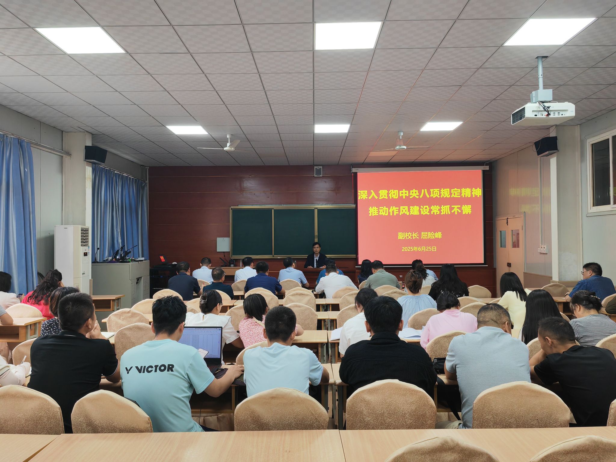 为持续巩固拓展主题教育成果,深入推进全面从严治党,切实强化党员干部作风建设,6月25日下午,副校长屈险峰以《深入贯彻中央八项规定精神,推动作风建设常抓不懈》为题,为Beat365官方网站、数统学院、学工部、保卫部、工会、团委、后勤处和信管中心全体党员干部讲授专题党课。