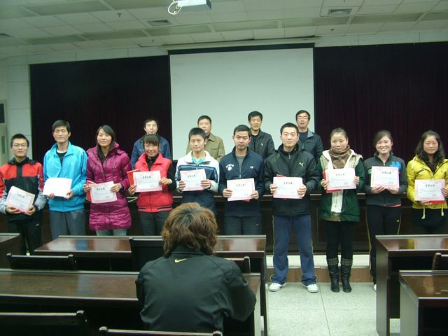 许宝林副主任针对此次实习工作和实习生的经验介绍做了总结讲话。鲁宗成宣布了2010年教育实习试讲优秀教案获奖者名单和参加学院第二届“金雀杯”大学生辩论赛获得第三名的我系代表队名单,体育系领导为上述获奖者颁发了证书和纪念品。