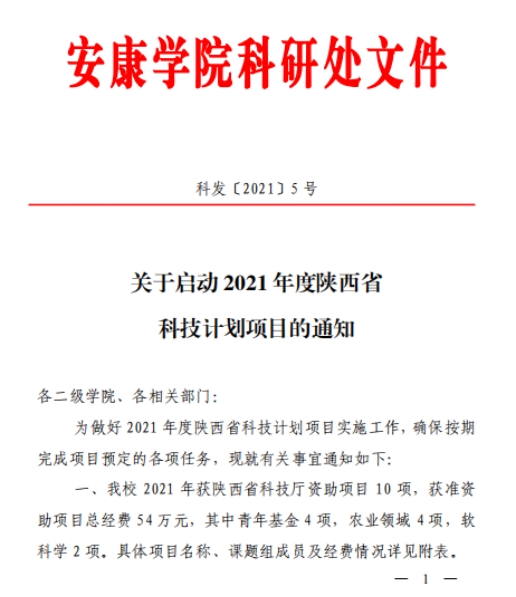 近日,陕西省科技厅公布了2021年立项文件(陕科发[2021]2号),Beat365官方网站获批1项一般项目(青年)-----《富硒绿茶影响大鼠线粒体氧化应激的机制》,项目编号:2021JQ-834。