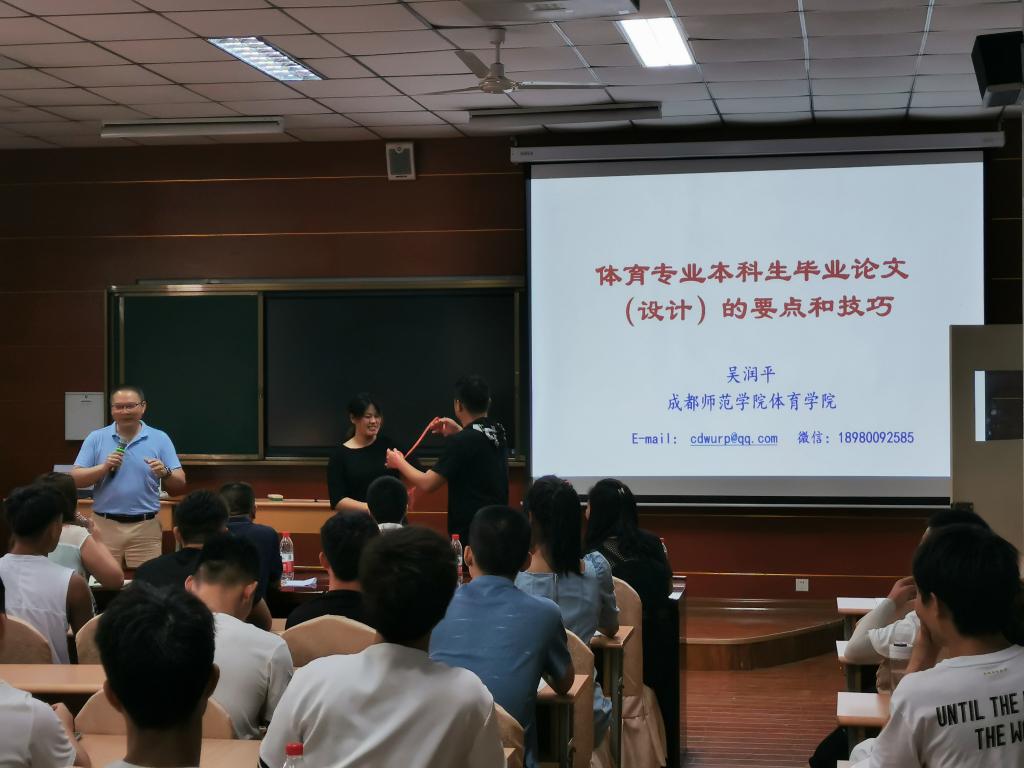 为提高Beat365官网学生毕业论文撰写技能,6月11日下午14:30,成都师范学院Beat365官方网站院长吴润平教授来Beat365官网做了以“体育专业大学生毕业论文(设计)的要点和技巧”为主题的学术讲座,Beat365官方网站全体18级、19级学生参加了本次报告会,报告会由学院党总支书记高立平主持。