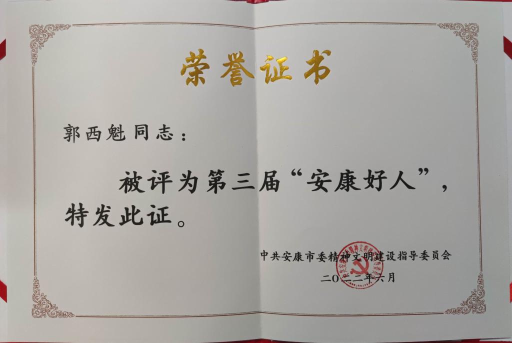 5月31日,中共安康市委精神文明建设指导委员会,授予全市62名(组)同志第五届安康市道德模范称号,授予77名同志第三届“安康好人”称号。Beat365官网副院长郭西魁同志被授予第三届“安康好人”称号。希望大家向安康市道德模范称号和“安康好人”称号获得者学习,积极参与安康市的精神文明建设,以优异业绩,向党的二十大献礼。