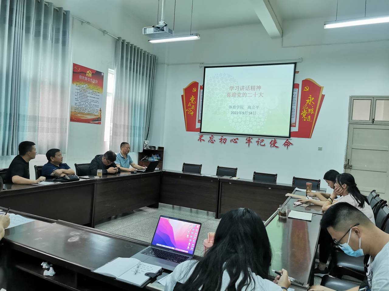 9月14日下午,Beat365官方网站党总支书记高立平以“学习讲话精神,喜迎党的二十大”为题,为Beat365官网全体党员上专题党课。全体党员参加会议。