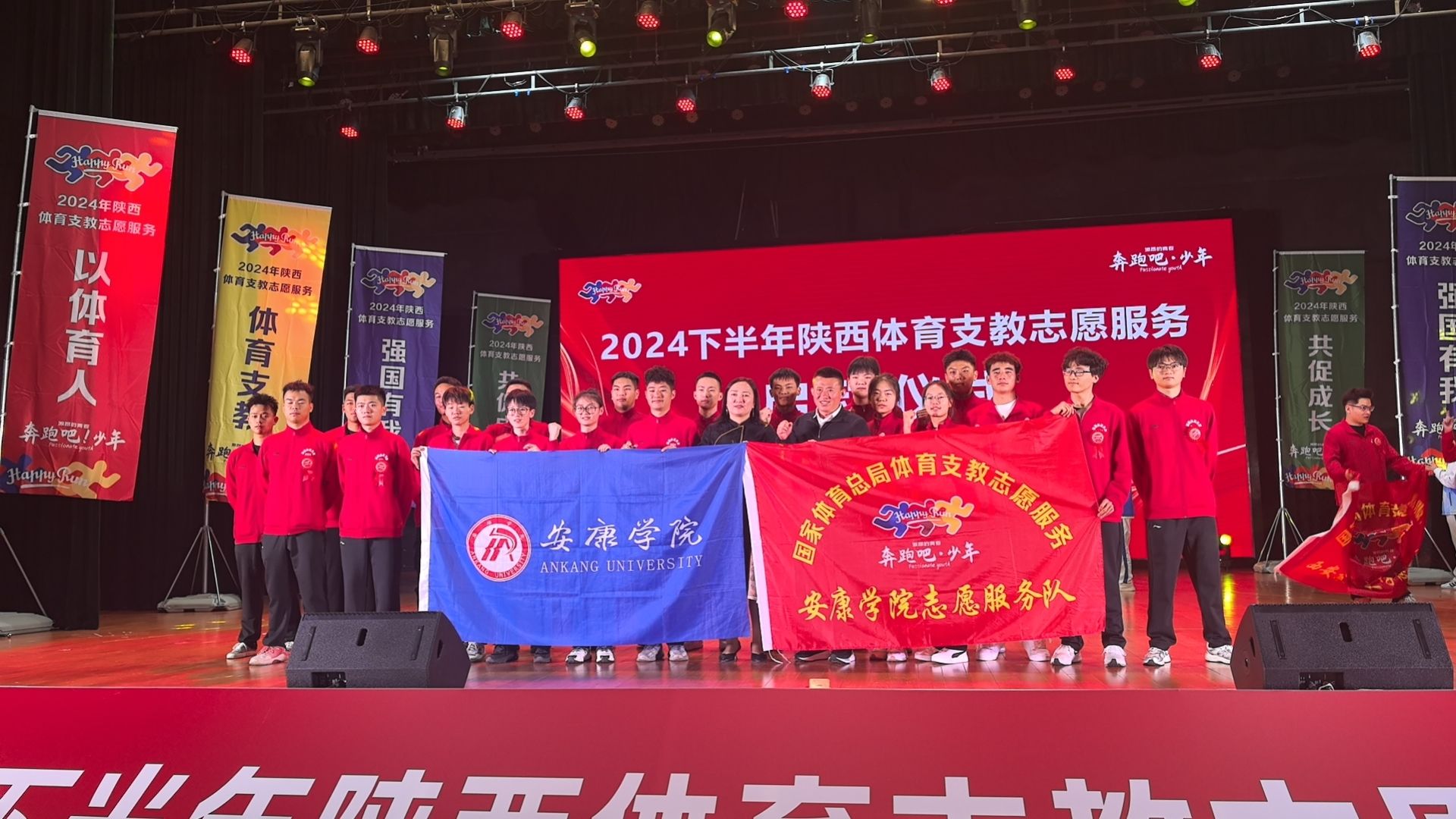 10月13日上午,2024年下半年陕西省体育支教志愿服务启动仪式在Beat365官方网站艺术馆大礼堂举行,省体育局、省教育厅、Beat365官方网站相关负责人共同为体育支教志愿服务队授旗。