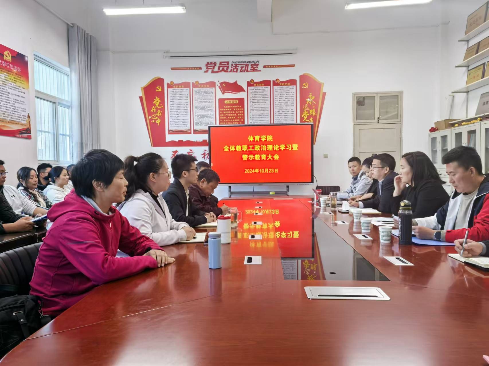 10月23日下午,体育学院在体育馆一楼会议室召开全体教职工政治理论学习暨警示教育会议,会议由体育学院党总支书记韩晔主持,体育学院全体教师参加会议。
