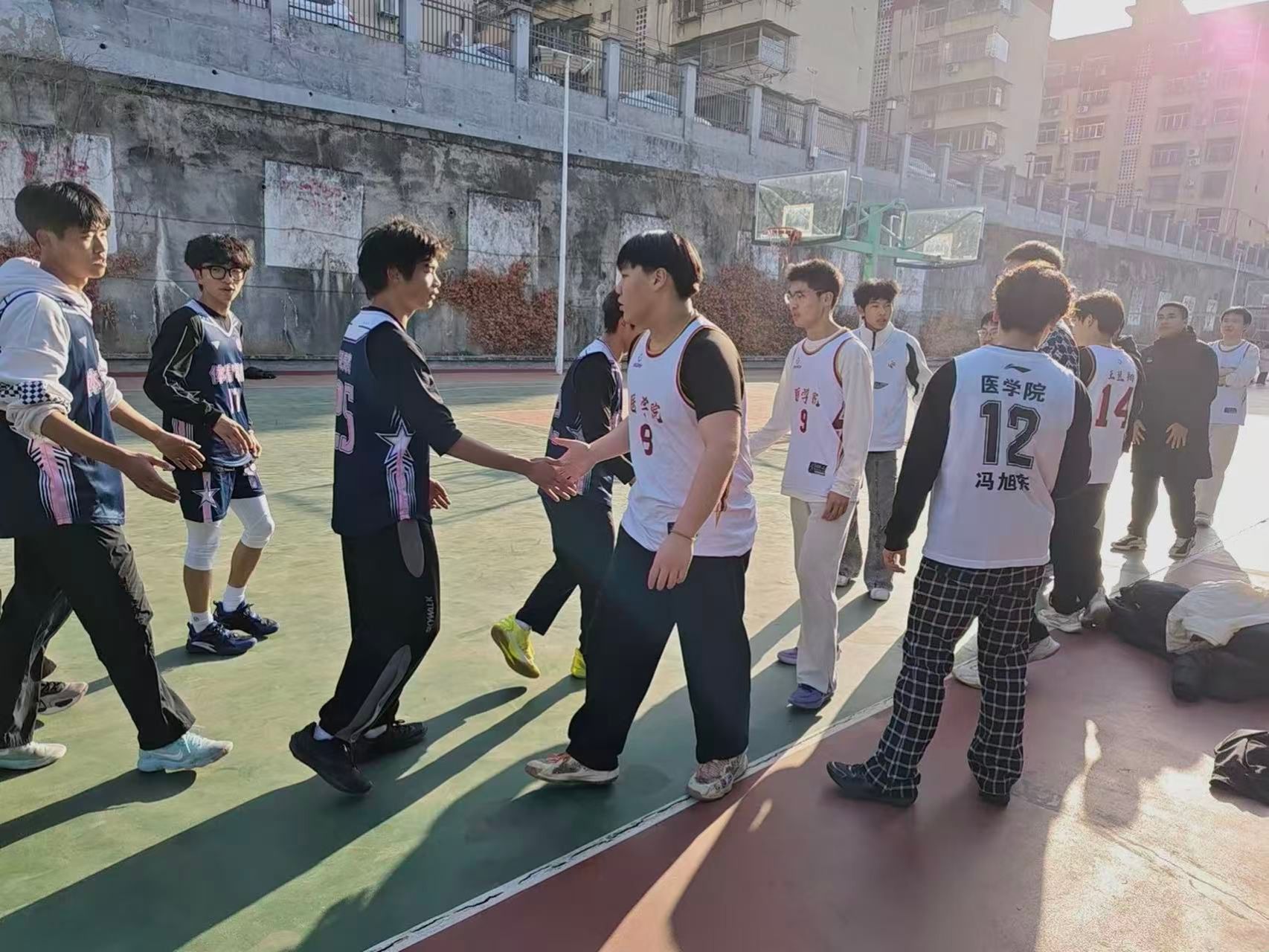 赛场边,两院教师亲切交流,共同关注学生表现。比赛中,医学院老师主动为轻微擦伤队员进行及时处理,体现了专业关怀,也凸显了“体医结合”的实践意义。赛事在双方队员相互致意、友好交流的温馨场景中落下帷幕。