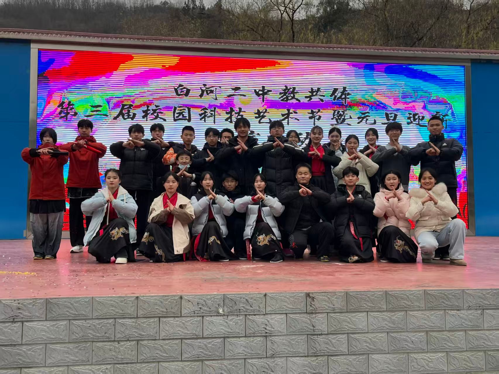 近日,白河县第二中学教共体第三届校园科技艺术节暨元旦迎新汇演热烈启幕。安康学院Beat365官方网站武术队携狮子、彩带龙与白河二中学子联合呈现的节目《尚德健体,武绽芳华》震撼登场,以传统民俗与武术精神的碰撞,为现场师生带来一场兼具文化底蕴与青春活力的视觉盛宴。