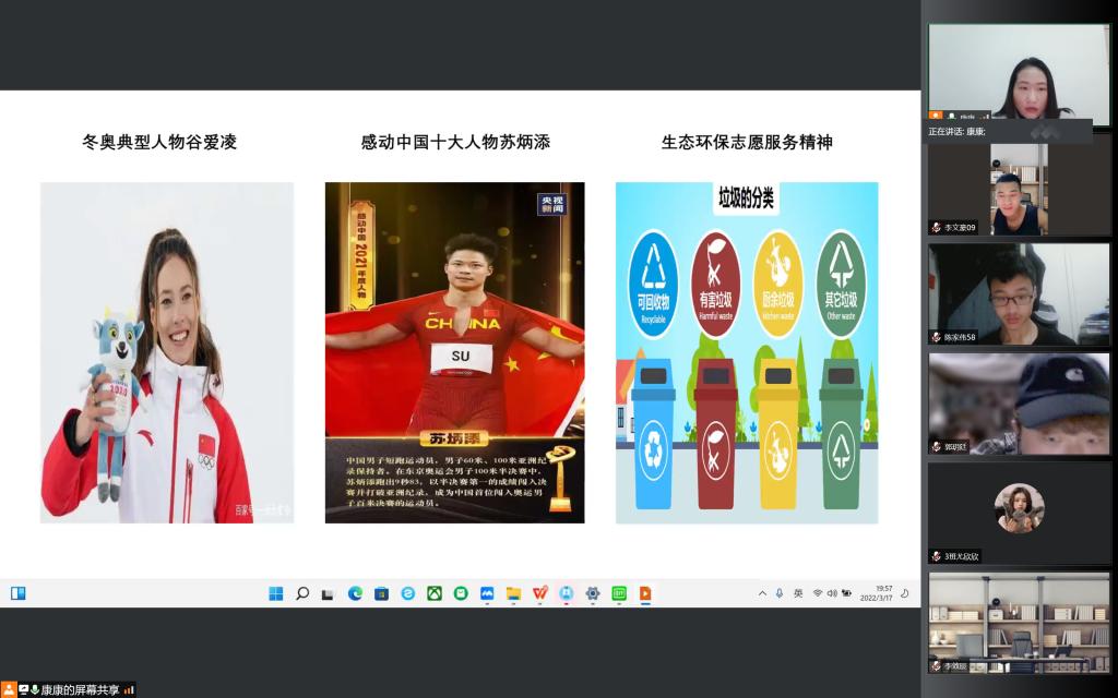 21级1班团支部书记司周杰带领同学们学习为国奉献的冬奥典型人物谷爱凌的事迹,21级2班团支部书记潘佳鹏带领同学们学习感动中国十大人物百折不挠的中国飞人苏炳添、失聪女孩逆袭的江梦南的典型事迹。