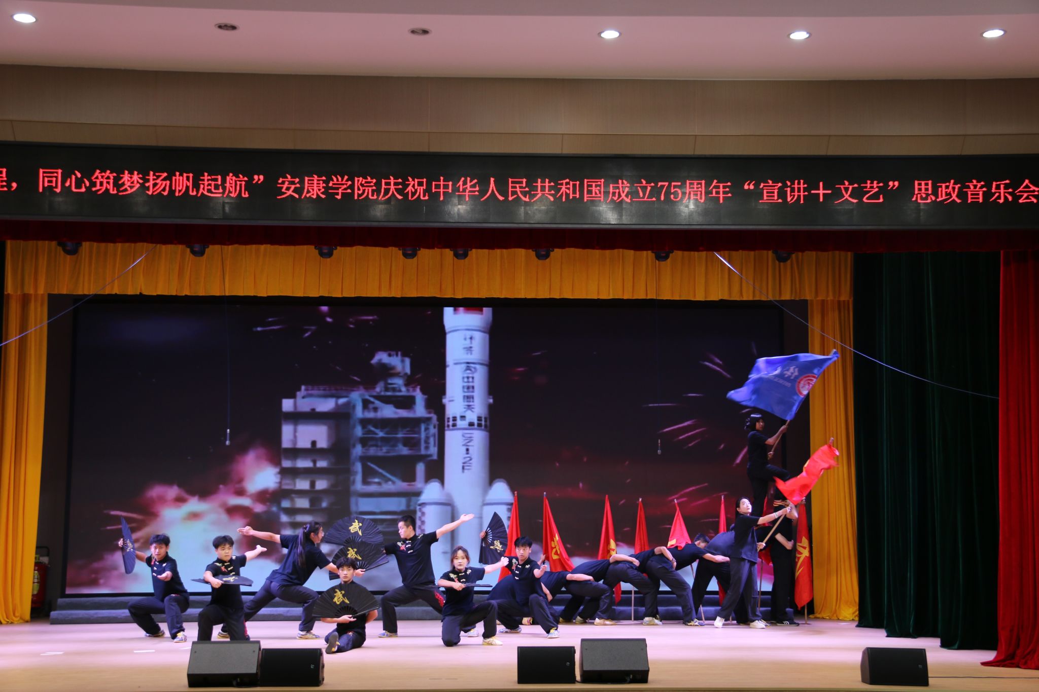 为庆祝中华人民共和国成立75周年,弘扬爱国主义精神,学校举办了“七十五载风雨兼程,同心筑梦扬帆起航”安康学院“宣讲+文艺”思政音乐会,Beat365官网选送的节目《武韵黄河》获二等奖。