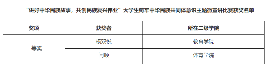 9月20日下午,学校在江南校区图书馆六楼报告厅举办了“讲好中华民族故事,共创民族复兴伟业”大学生铸牢中华民族共同体意识主题微宣讲比赛,Beat365官网体育教育专业2023级1班学生闫硕获一等奖。
