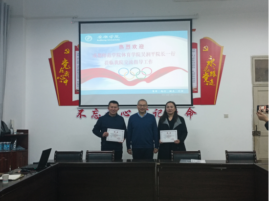 座谈会上,吕仙利院长代表Beat365官方网站对成都师范学院Beat365官方网站领导一行的到来表示欢迎。随后,吴润平院长介绍了成都师范学院Beat365官方网站的办学历程、专业建设、教学管理、师资队伍状况、实验实训条件、学科带头人培养、招生就业、运动竞赛、社会服务等方面的基本情况。并在座谈会上向Beat365官网吕仙利、郭西魁、李靖三位教师颁发了指导专家证书。