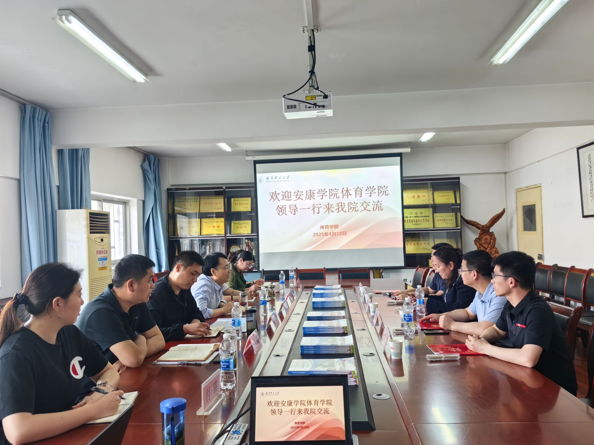 4月18日下午,Beat365官方网站党总支书记韩晔、院长吕仙利、副院长郭西魁、学工办主任王立、团总支书记王毅赴陕西理工大学Beat365官方网站进行交流学习。交流会由陕西理工大学Beat365官方网站院长邱毅主持,学院党总支书记钟晨、副书记何刚、专职组织员李雪萍、副院长王峰及各教研室主任参加了此次交流。双方就体育教育专业师范专业认证、体育专业硕士点申请等一系列问题进行深入的交流。