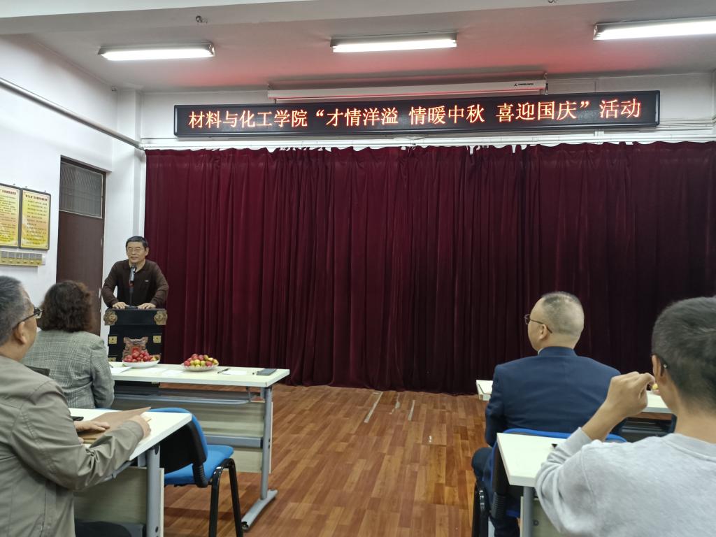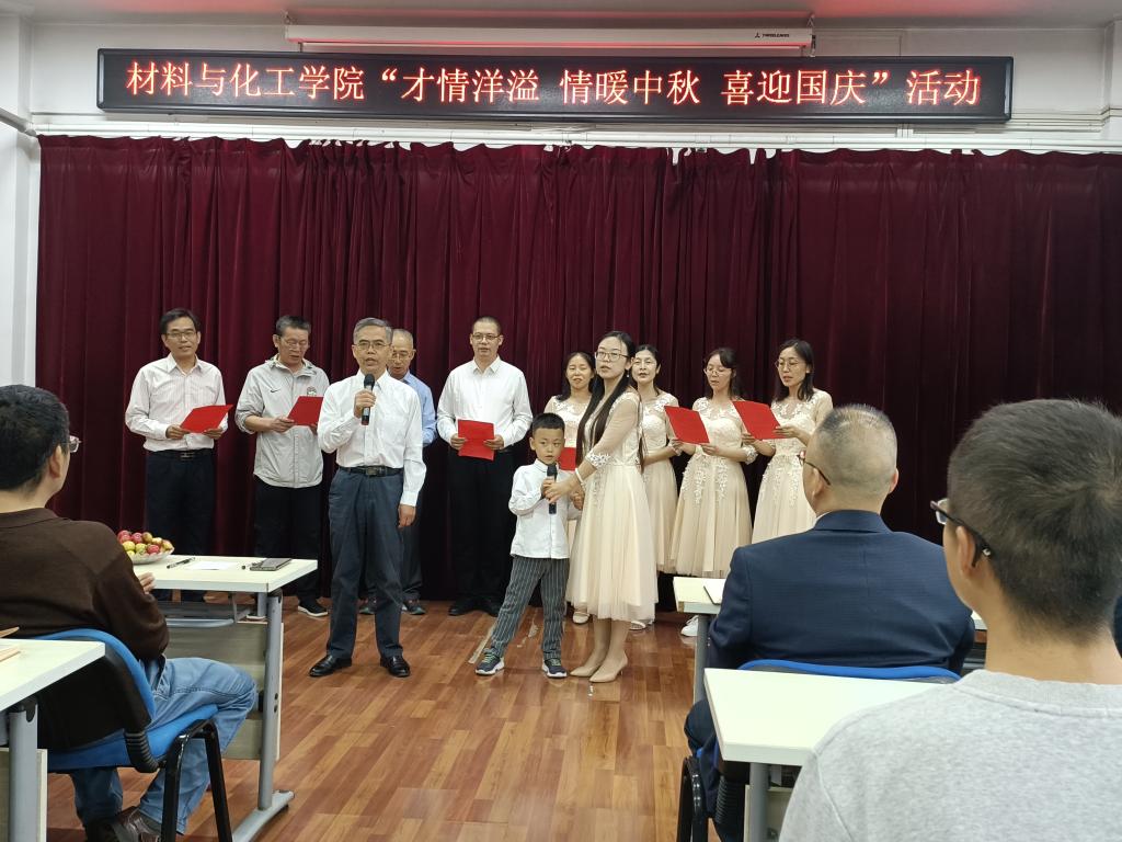 国庆将至,中秋即来。九月丹桂飘香,双节悄然而至。国庆是举国欢庆的重要节日,中秋是阖家团圆的传统佳节。在国庆节与中秋节“双节”来临之际,为庆祝“双节”,9月26日,材料与化工学院组织开展了主题为“才情洋溢 情暖中秋 喜迎国庆”的歌唱及诗歌朗诵比赛活动。学院全体教职员工参加此次活动,学校机关党委、教务处、科技处等部门的材化大家庭成员应邀参加活动。活动由学院孙俊哲老师主持。