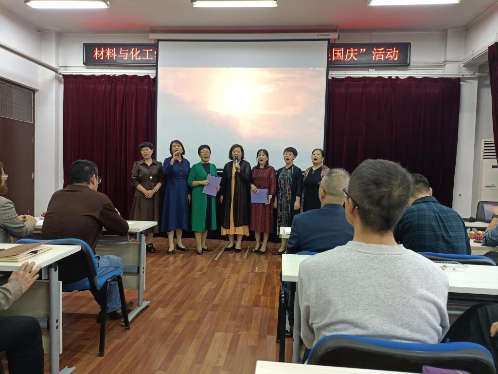 学院八个分工会小组依次表演。《歌唱祖国》、《歌颂祖国》、《祖国颂》、《万疆》表达了对祖国的无限热爱和祝福; 《八月十五月儿圆》唱出了浓浓中秋情;《你真的很不错》、《隐形的翅膀》激励我们砥砺前行;《这盛世如你所愿》表达了披荆斩棘,追求美好的决心。最终,实验中心工会小组演唱的《万疆》被评为一等奖,材料科学与工程小组的手语表演《你真的很不错》和高分子材料与工程小组的诗歌朗诵《歌颂祖国》及办公室工会小组合唱的《八月十五月儿圆》被评为二等奖,化学工程与工艺小组的诗歌朗诵《这盛世如你所愿》和应用化学小组的诗歌朗诵《祖国颂》和先进材料研究中心小组演唱的《隐形的翅膀》及材料成型与控制工程的合唱《歌唱祖国》评为三等奖。