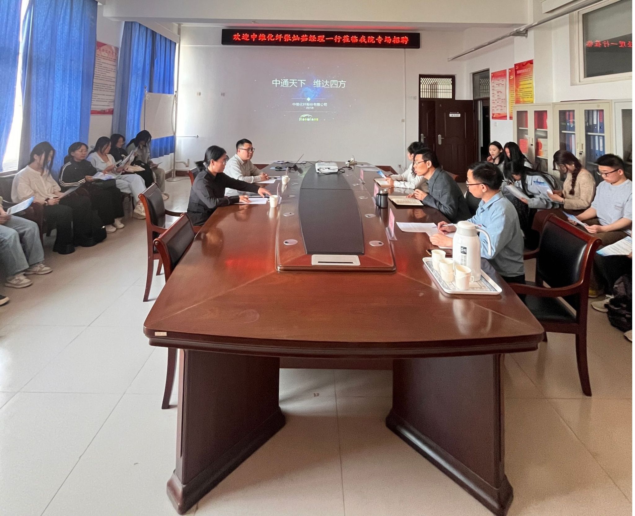 3月25日下午,中维化纤股份有限公司张灿茹经理、项目技术负责人王纪冬一行莅临永利官网专场招聘,会议由院长焦明立主持,学院副书记熊瑛、高分子系教师李玉南,高分子、化工专业本硕学生40余人参加招聘会。