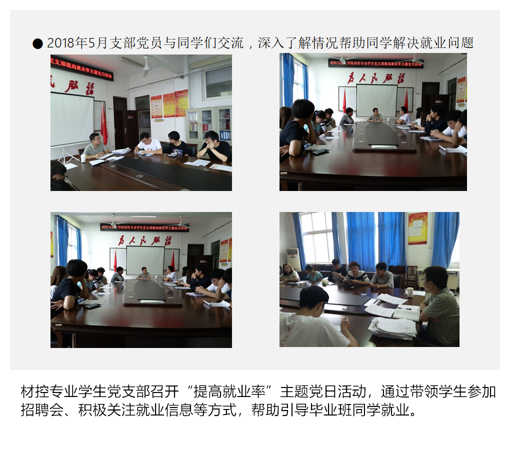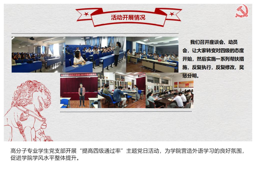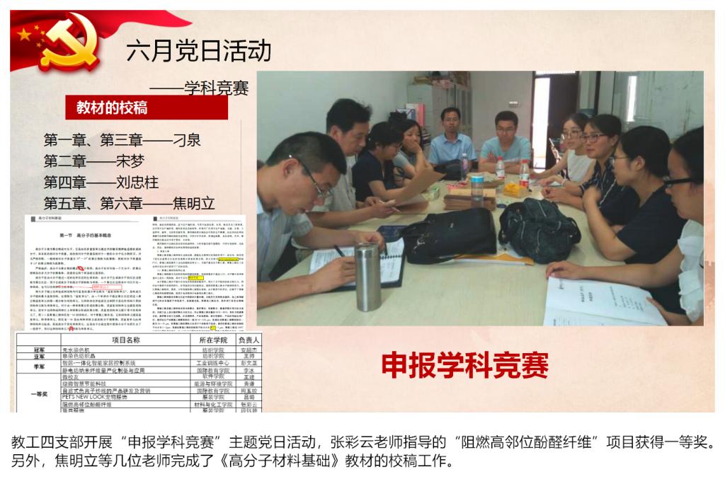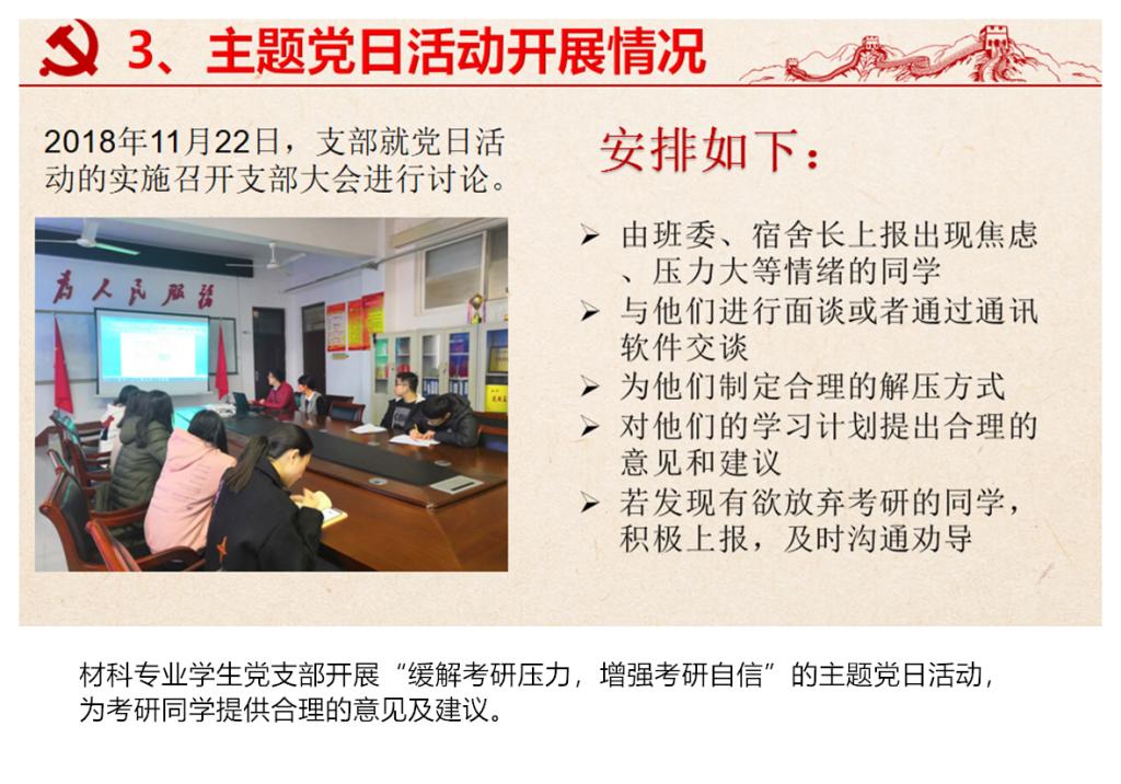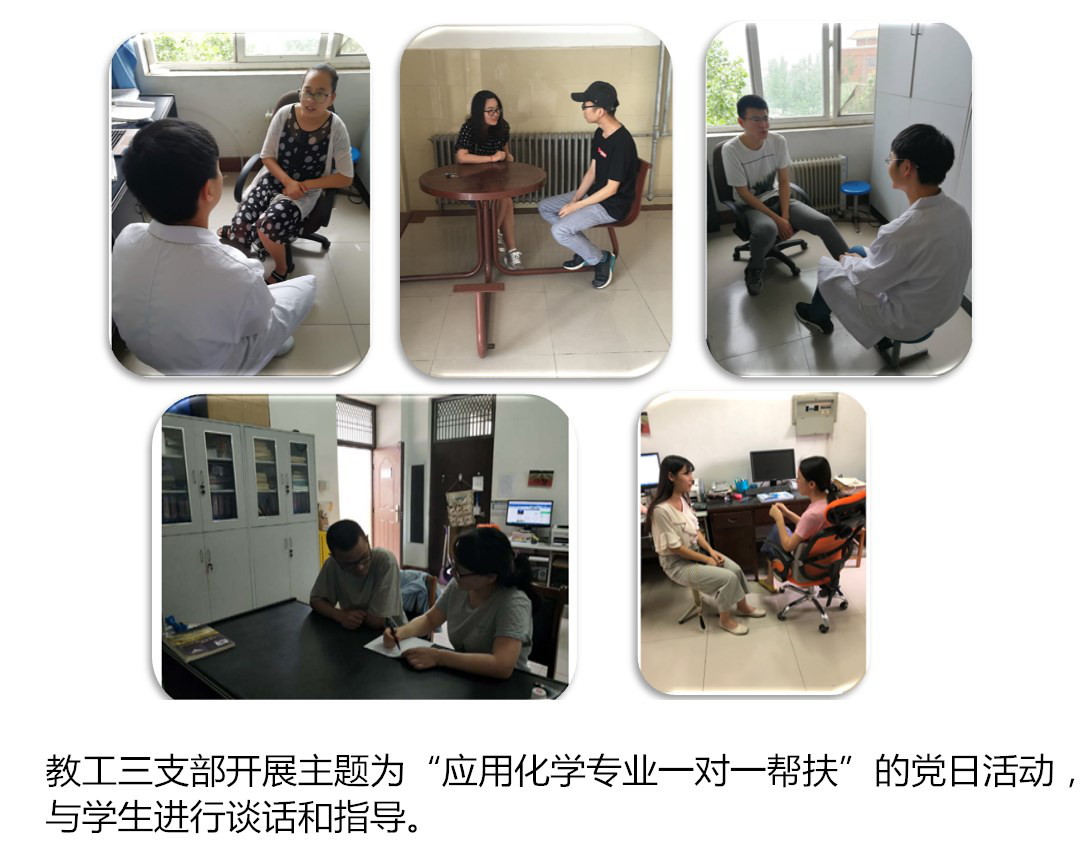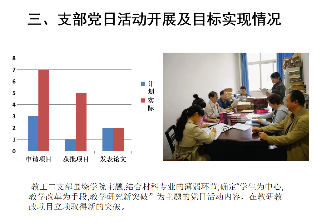 教工一支部支部发挥专业优势制定了签订校企合作协议的目标,目前已签订协议11项,完成横向经费入账150万余元,超额完成了目标;教工四支部针对教学教研薄弱的情况,积极寻找突破口,计划撰写并出版教材1本、教研项目申请书2项、发表教改论文2篇,目前均超额完成任务,除此之外,焦明立、刁泉老师指导的创新团队获得2018年河南省“互联网+”大学生创新创业大赛一等奖并获得国赛铜奖,“高分子材料与工程”获批2018年永利yl23411官网“专业综合改革试点”立项建设;以“以应用化学专业思政项目组”为载体,成立了教工七支部,创新了基层党组织建设,探索了“知识传授与价值引领同频共振”的有效路径。高分子专业学生党支部开展以“提高四级通过率”为主题的党日活动,通过对16级各班英语四级通过情况统计分析确定帮扶对象,帮扶前该班四级通过率为16.7%,帮扶后通过率达到40%,提升了一半以上。材科专业学生党支部开展以提高考研率为主题的党日活动,目标是研究生考取率达到30%,目前材科15级学生有74%参加了考研,过线率已经达到46.15%;研究生党支部针对学生科研成果少且质量不高的实际情况,制定了提升科研成果的活动计划,完成了25项学术成果,其中一区文章1篇,三区文章3篇,四区文章1篇,EI论文1篇,中文期刊4篇,专利14项,国家级竞赛奖1项。
