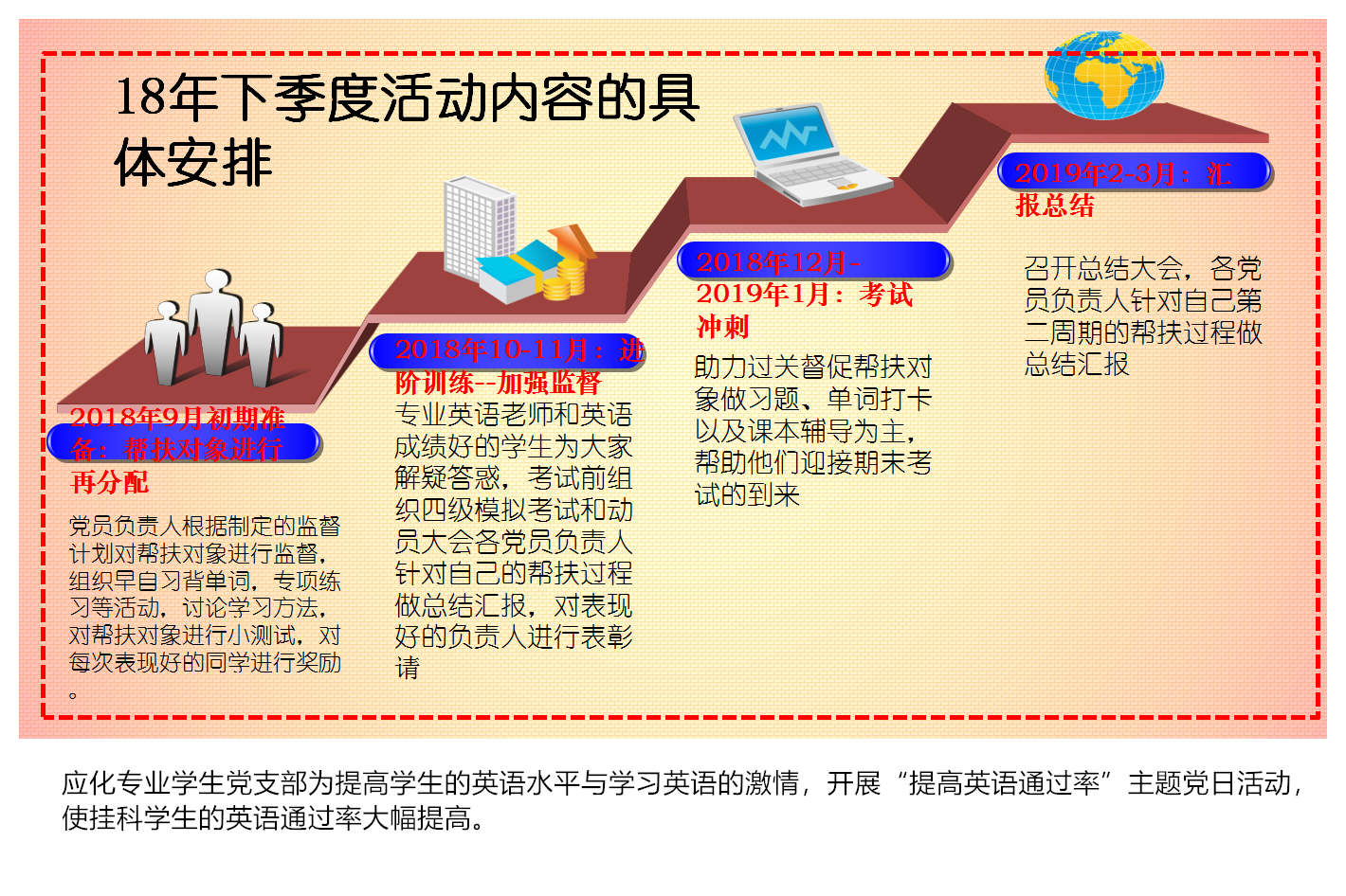党建聚力攻坚克难。一年来,通过高质量的党建工作引领,各支部坚持问题导向,将党建工作与学院发展结合起来,不断推动党建工作与中心工作的深度融合,将党建工作与师生关心的问题结合起来,融入中心抓党建、统筹推进抓党建,不断强化党员的身份意识和党支部的组织意识。2018年各支部均按时按质完成既定的计划和目标。