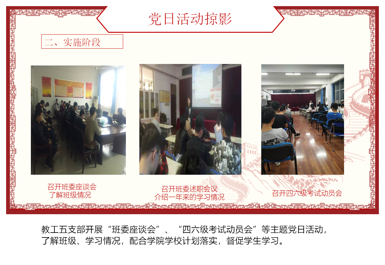 2018年3月,分别召开总支委员会议和全体支部书记会议,讨论和布置2018年度各支部党日活动规划。杨佩书记要求,要将新思想、新内容、新成果纳入到政治理论学习的范畴,各支部书记要讲好一门党课,落实党课教育;要以学校、学院的重点工作为抓手,充分发挥全体党员的积极性和主动性,促进党建工作和日常的教学科研、学风建设等工作的有机结合,全面助力学院发展。同时,紧盯党日活动方案把关。针对各支部上报的主题党日活动计划,统一进行把关:审核主题是否明确、是否体现了时代性和阶段工作特点,审核内容是否符合学院工作重点。确保活动方案规范、可操作。对审核不过关的,各党支部反复修改,确保方案质量达标。