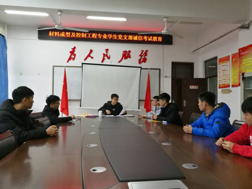 为了进一步体现党员先进性,抓好重要节点、重大活动的党员教育,2018年12月5日,材料成型及控制工程专业学生党支部全体成员在2号实验楼526教室召开学期期末诚信考试教育大会。会议由党支部书记邢军阳主持。