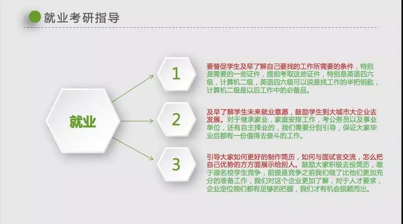 “要往山上走,顺问下山人”。当你我面临毕业就业时,班主任是“过来人”,他们的经验之谈对即将就业学生的用处可想而知。除了一些经验之谈,班主任指导学生进行职业生涯规划,树立科学的成才目标,有计划、有针对性地拓展综合职业能力,提升自身竞争力,做到“毕业即成才”。