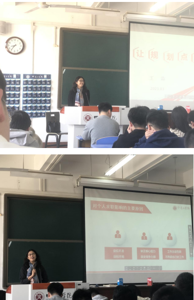 随后,王老师用三个小故事抛砖引玉,为大家进行生涯规划指导,深入浅出地分析了对个人求职影响的主要原因及生涯发展的基本维度等方面。勉励同学们要清楚地认知自我,多结合自身了解当前就业形势,及早地对未来做好规划,乘风破浪,迈向属于自己的广阔天空。