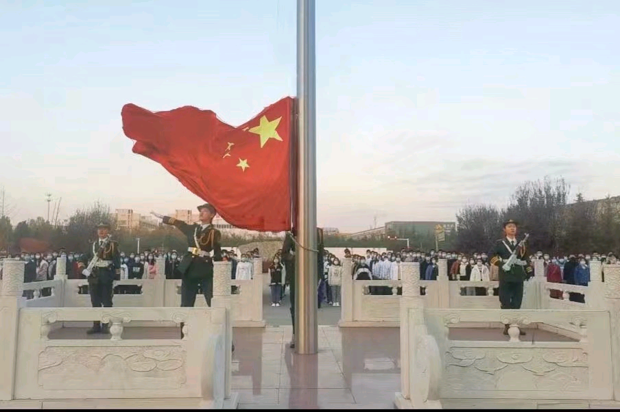清风徐来,晨光熹微。全体同学佩戴口罩整齐列队,庄严以待。主持人宣布升旗仪式正式开始,英姿飒爽的国旗护卫队迎着初生的朝阳,伴着嘹亮的口号,以饱满的热情,坚定的步伐护卫着五星红旗步入升旗台。伴随着激昂的《义勇军进行曲》,全体同学肃立,注视着鲜艳的五星红旗冉冉升起,激发了同学们不断向上的斗志,点燃了强烈的爱国热情。
