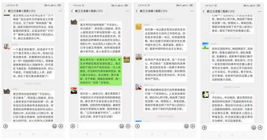 教工七支部主要通过各自观看电视、网络直播的方式,在支部微信群中讨论《榜样4》的观看情况和观看感受。各位党员在微信群中积极发言,表示这些先进人物是我们每一个党员学习的好榜样。