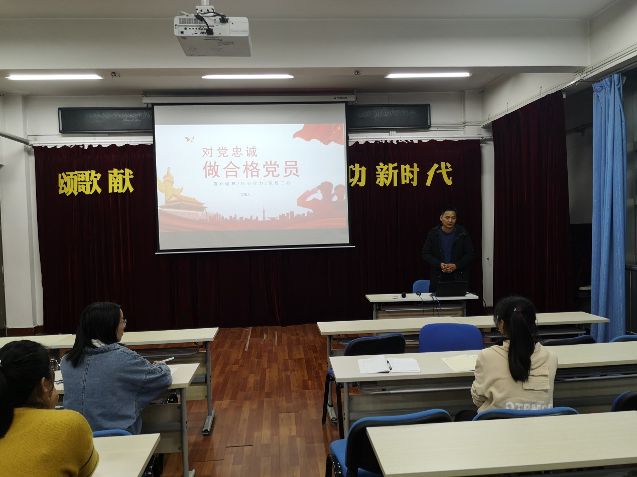 研究生学生党支部书记陈孔耀以“对党忠诚,做合格党员”为题,解释了对党忠诚的重要性,阐释了在对党忠诚方面,要自觉做到知行合一、彰显忠诚,为人民谋福利。