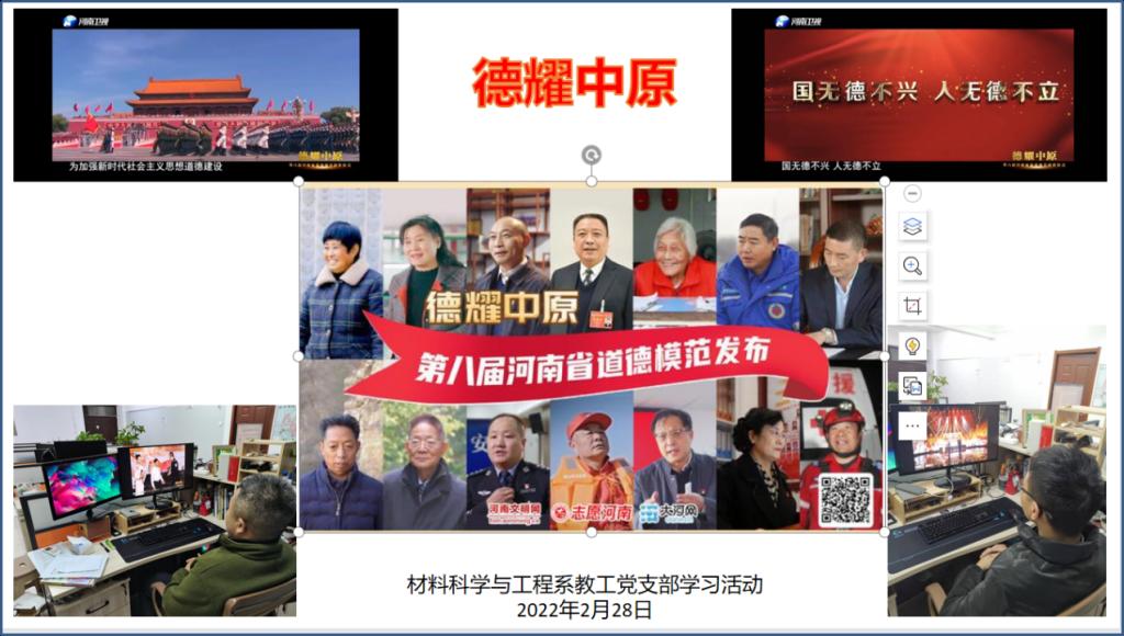 完善制度建设体系,增强教育培训内力。完善“三会一课”制度、主题党日制度,不断激发队伍活力。组织学习《中国共产党普通高等学校基层组织工作条例》,组织收看了第八届河南省道德模范颁奖仪式,一个个感人事迹,生动讴歌了热爱祖国、奉献人民的家国情怀,自强不息、砥砺前行的奋斗精神,积极进取、崇德向善的高尚情操。疫情期间积极响应党员就地转为社区志愿者的活动,全面参与社区疫情防控工作。组织参加统战知识学习与竞赛活动。组织收看中国共产主义青年团成立100周年大会。希望通过学习加强党员教育针对性,增强教育培训时效性,改进培训方式,强化支部党员理论功底和综合素质。依托材料科学与工程系,积极挖掘先进党员典型,总结典型经验,发挥榜样力量。加强党员教育,不断改进工作方式,提炼总结特色亮点,助推党员教育培训工作再上新台阶。